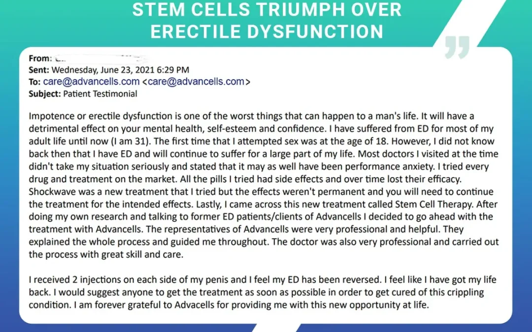 I learned about a new treatment called Stem Cell Therapy. Since I tried so many medications and it didn’t work, there was no harm in trying another new therapy. So, after doing my own research and speaking with former Advancells ED patients, I decided to proceed with the therapy. Advancells representatives were quite professional and efficient. They walked me through the entire process and explained everything. The doctor was also very experienced, and the procedure was carried out with excellent expertise and care.